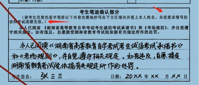 2.完成课程笔迹确认信息采集。考生应在答题卡指定位置认真完整抄写“考生笔迹确认部分”内容并签名(抄写样例如下图),省教育考试院将采集此处的抄写内容作为考生笔迹信息,并随课程成绩记入考生考籍档案。凡未完整抄写规定内容、字迹不清晰或未签署本人姓名,该课程考试成绩无效。