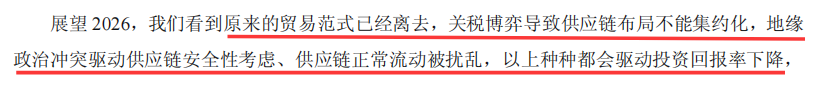 海尔智家对此也有比较清醒的认知,公司在展望2026年时坦言,“原来的贸易范式已经离去,关税博弈导致供应链布局不能集约化,地缘政治冲突驱动供应链安全性考虑,这些因素将共同导致投资回报率下降”。