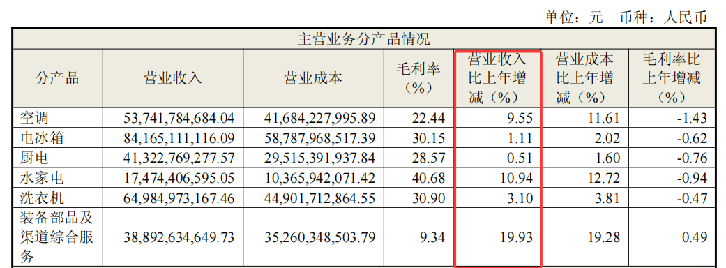 尽管空调产品和水家电表现相对亮眼,装备部品及渠道综合服务增速达19.93%,但这些业务营收与传统品类差距大,主力产品增长乏力、新业务规模尚难补缺口,整体业绩增长面临较大压力。