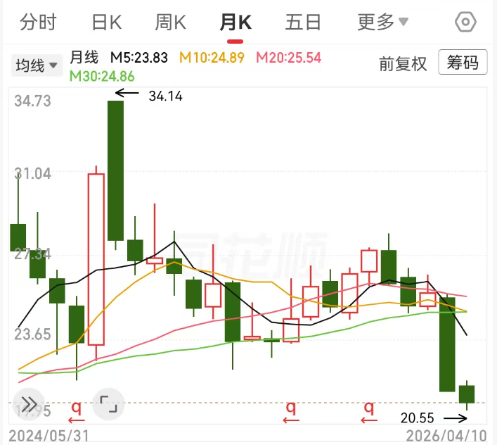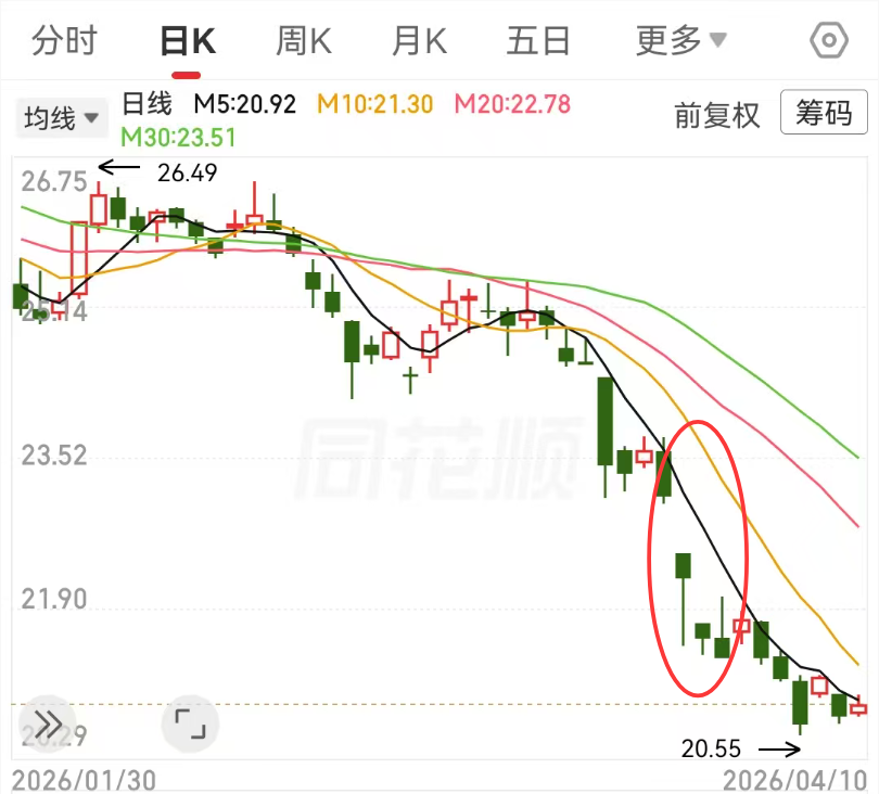 但财报发布后,股价却一路走低。截至4月10日收盘,股价收跌至20.88元/股,10个交易日累计下跌近10%。在此期间,上证指数上涨2.73%。