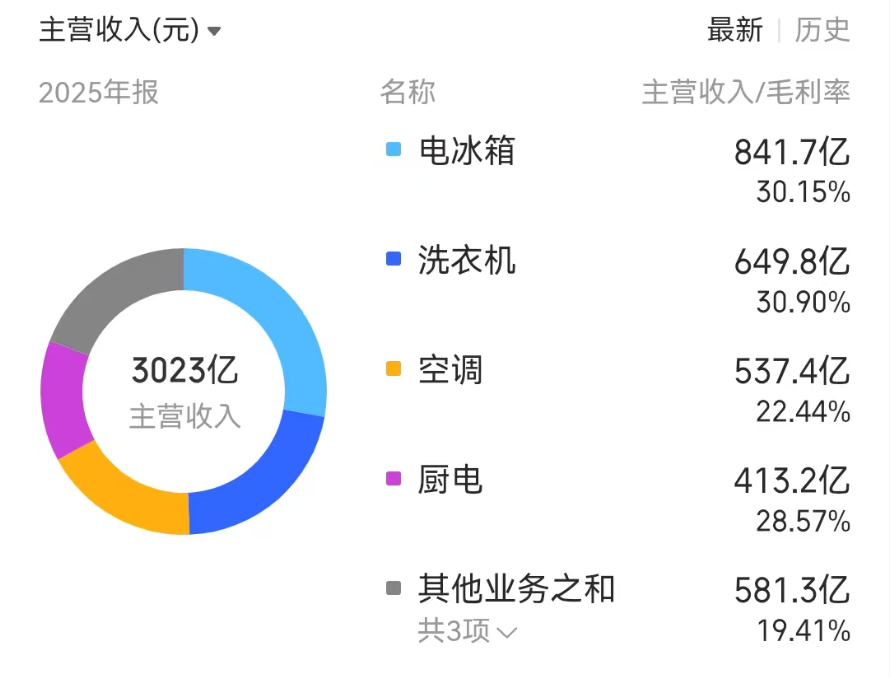其中,冰箱2025年营收842亿元,占总营收近三成,可增速仅为1.11%,几乎陷入停滞;洗衣机营收650亿元,增速3.10%,同样处于低位;厨电产品营收413亿元,增速仅0.51%,近乎原地踏步。