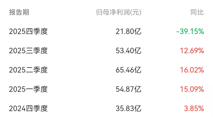 但到了第四季度,情况急转直下。公司营收683亿元,同比减少近7%,环比减少12%;归母净利润22亿元,同比下降39%,环比下降59%,增长趋势戛然而止。