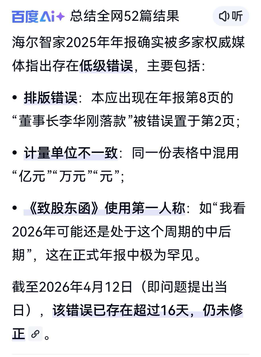 此外,海尔智家年报还出现低级错误,引发市场广泛关注。
