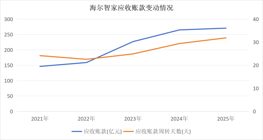 海尔智家2025年应收账款净额270亿元,约为归母净利润的138%,周转天数增长至约32天,资金回笼变慢、坏账风险上升。